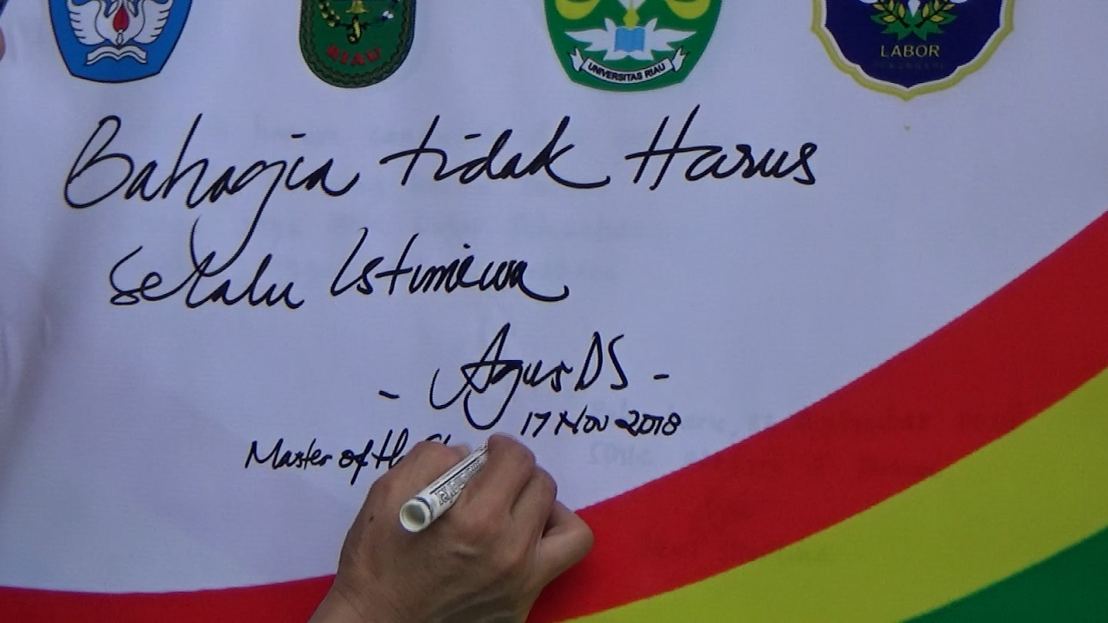 Di akhir sesi, Kak Agus DS diberikan kesempatan untuk menuliskan sebuah kalimat motivasi yang telah disediakan SMK Labor, “Bahagia tidak Harus Selalu Istimewa” yang akan diletakan di sudut literasi “Literasi Corner”.